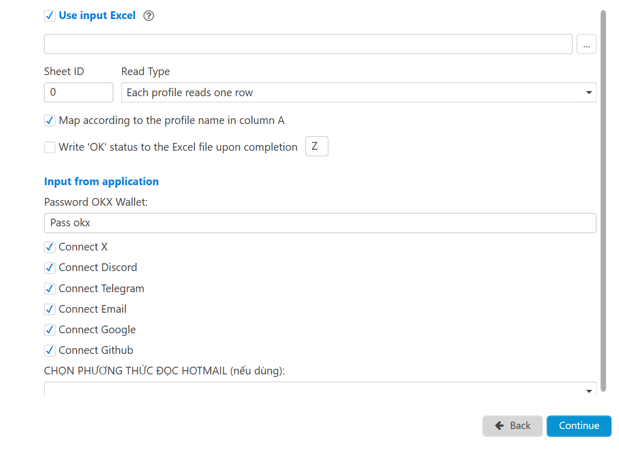 - Chọn file Excel đầu vào ứng dụng, chọn map profile theo cột A + chế độ mỗi profile đọc 1 dòng.