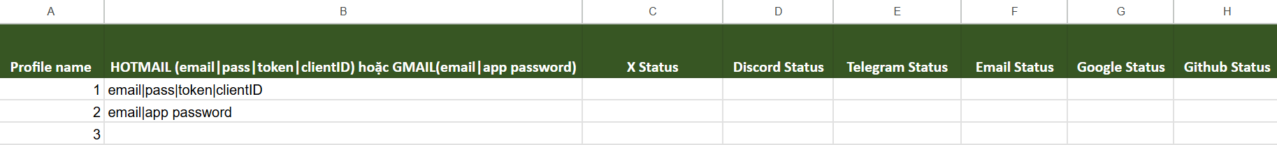 - HOTMAIL (email|pass|token|clientID) hoặc GMAIL(email|app password): diền thông tin cách nhau bằng dấu " | " không khoảng cách.