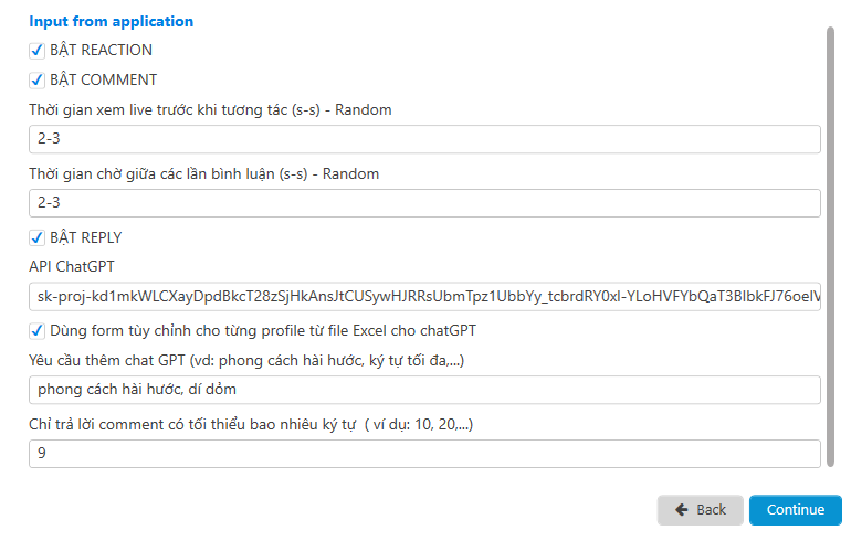 + Thời gian chờ giữa các lần bình luận (s-s): là khoảng thời gian giữa các bình luận mà script thực hiện để tự nhiên như người dùng thật. Ví dụ: 2-3 là random 2-3 giây.