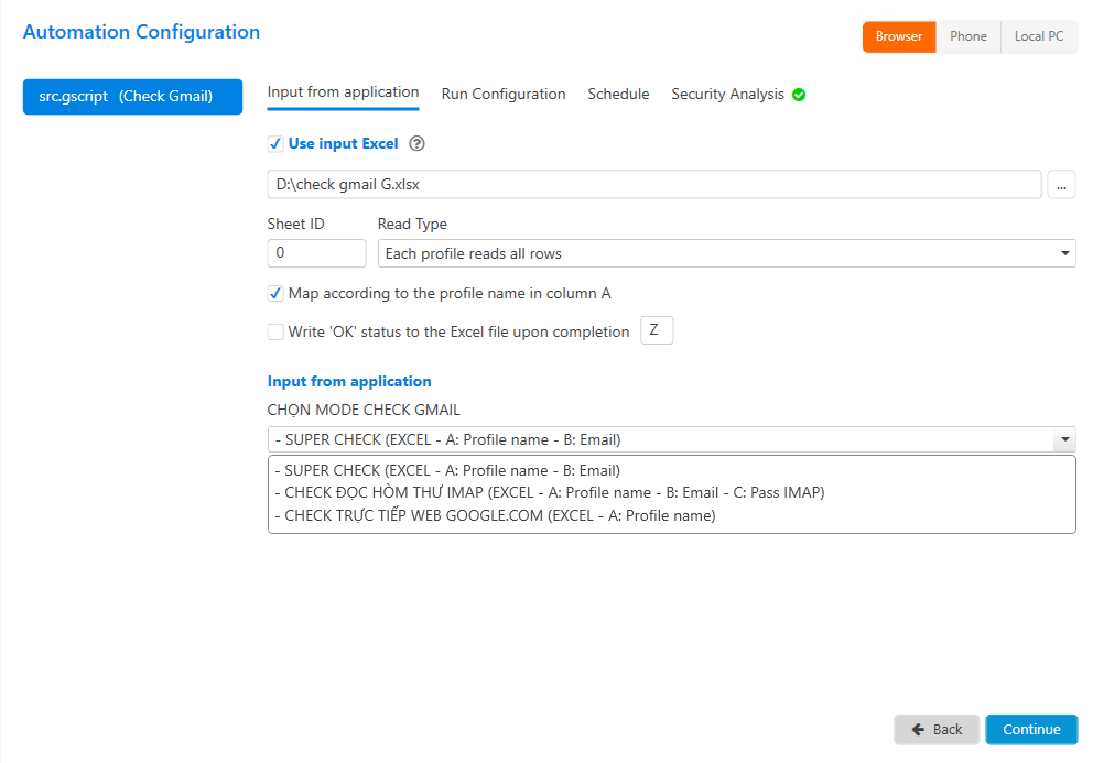 - Đầu vào Excel A: Profile name, B: Email (C: Pass IMAP - nếu chạy Mode CHECK IMAP)