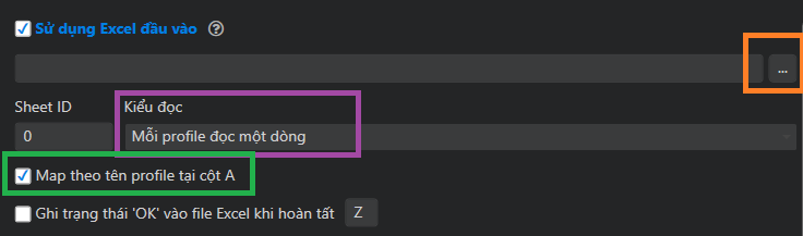 Bấm ô màu cam để nhập file excel vào script, chỉnh lại kiểu đọc như ô màu tím, và tick vào ô màu xanh lá cây