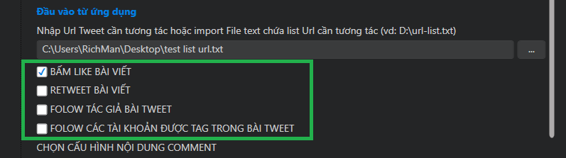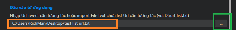 Nếu anh em tương tác nhiều tweet thì lưu các url vào file text (mỗi link một dòng), bấm vào ô xanh lá cây để link file text vào script