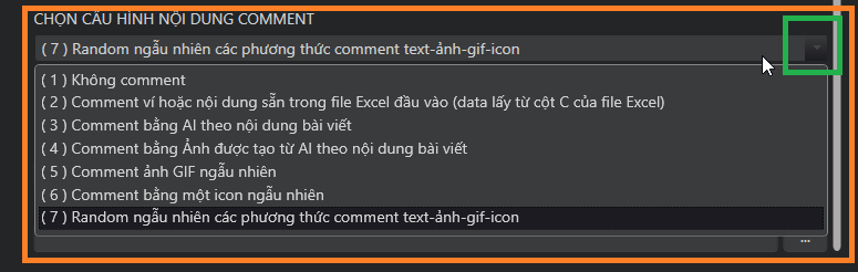 - Ô màu cam, chọn ngôn ngữ để AI tạo nội dung cho bình luận, có tiếng anh và Tiếng Việt. anh em click vào ô xanh lá cây để chọn nhé.