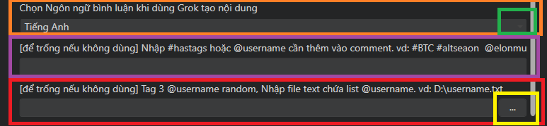 - Ô màu đỏ, ô này sẽ chọn ngẫu nhiên 3 username từ list có sẵn của anh em và tag vào ở cuối comment. anh em bấm vào ô màu vàng để import file text chứa username vào nhé, có @ hoặc không đều được, script sẽ check và điều chỉnh cho anh em.